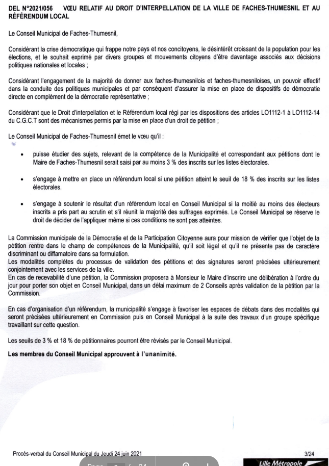 Considérant l'engagement de la majorité de donner aux faches-thumesnilois et faches-thumesniloises, un pouvoir effectif dans la conduite des politiques municipales et par conséquent d'assurer la mise en place de dispositifs de démocratie directe en complément de la démocratie représentative;